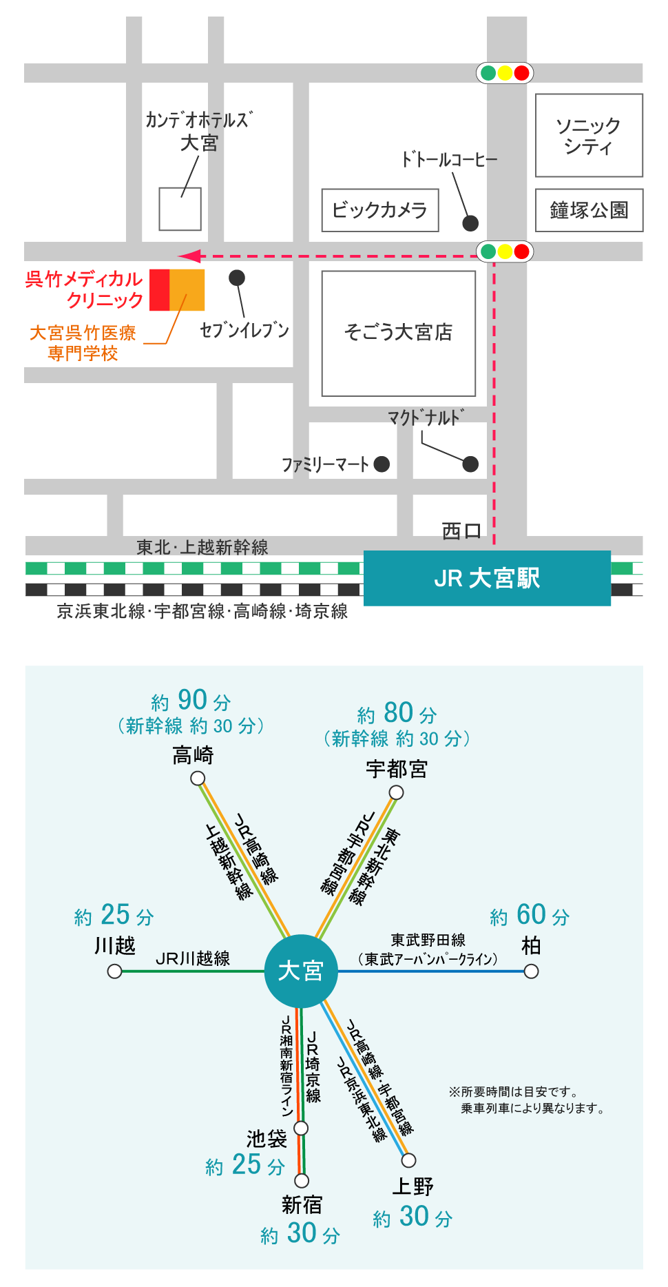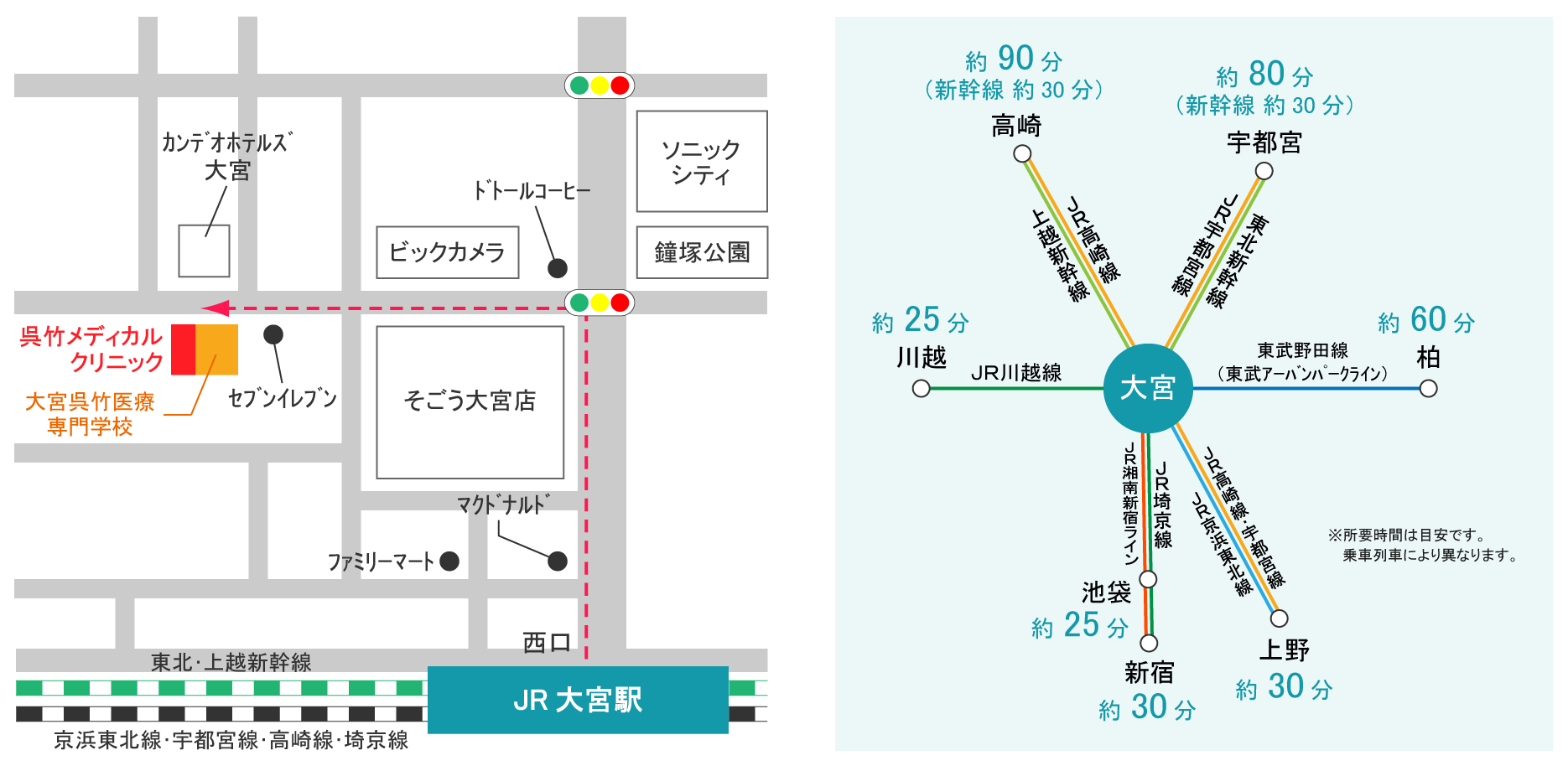 呉竹メディカルクリニック・大宮呉竹医療専門学校地下駐車場をご利用ください。