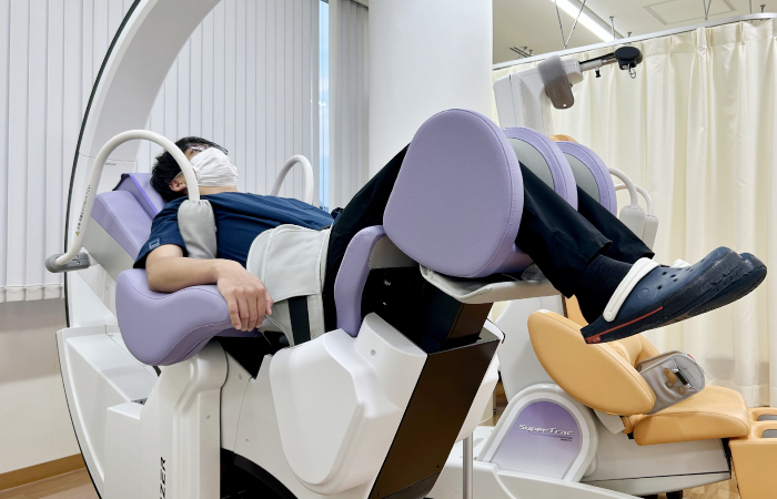 牽引治療とは負担のかからない正しい姿勢で牽引し、椎間部の負担を軽減します。また姿勢を保つため腰部・背部の筋肉をストレッチすることができます。