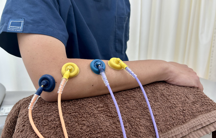 刺激の感じ方が鍼治療に近いことから電子鍼ともいわれています。患部の痛みやしびれを和らげます。
